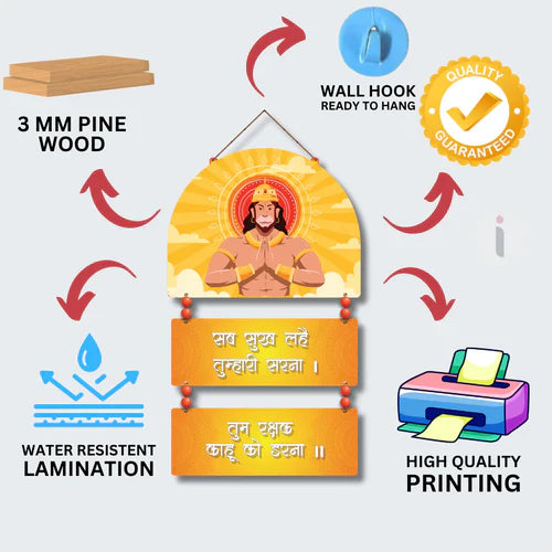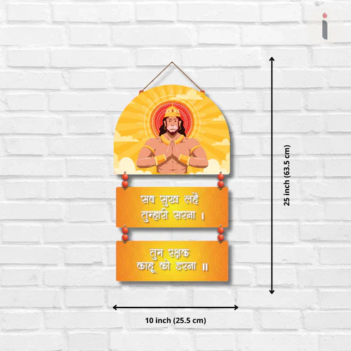 Elevate your sacred space with this beautifully crafted Lord Hanuman Wall Hanging, a powerful symbol of spiritual energy, protection, and unwavering devotion. Featuring a vibrant image of Hanumanji alongside his sacred mantra, this piece invokes courage, peace, and divine blessings wherever it is displayed.