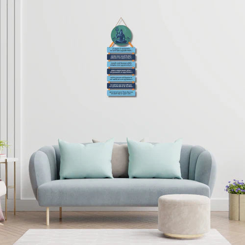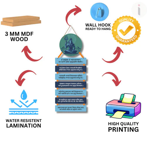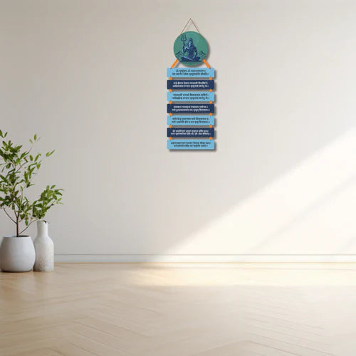 Invoke peace, healing, and divine protection with this exquisitely designed Mahamrityunjaya Mantra Wall Hanging. Adorned with a serene illustration of Lord Shiva in meditation, each wooden strip carries verses from the sacred Mahamrityunjaya Mantra — revered for its power to bestow longevity, remove fear, and bring spiritual strength.