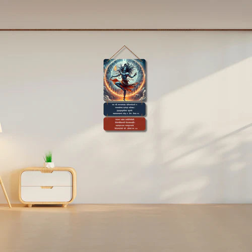 Surrounded by the flames of the eternal fire, Shiva embodies the eternal cycles of the universe. Beneath this captivating imagery, two beautifully crafted panels feature sacred verses from the Shiva Tandava Stotram in Sanskrit, revered for invoking divine strength, focus, and devotion.