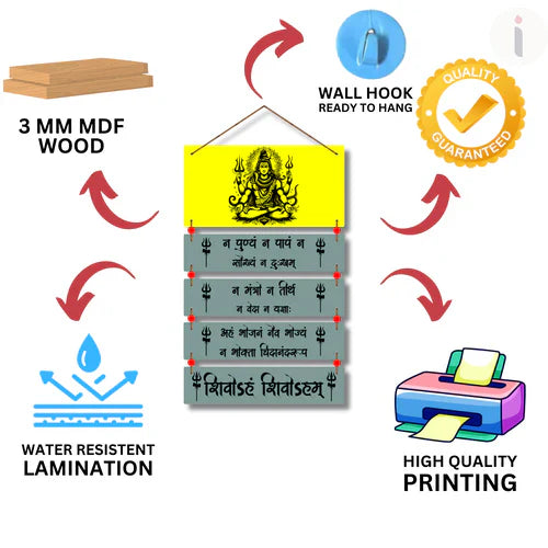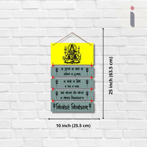 Bring home the profound wisdom of Adi Shankaracharya’s Nirvana Shatakam with this spiritually uplifting wall hanging. Designed in a graceful cascading plank style, it begins with a divine portrait of Lord Shiva in deep meditation, set against a radiant yellow backdrop that symbolizes enlightenment and inner peace.